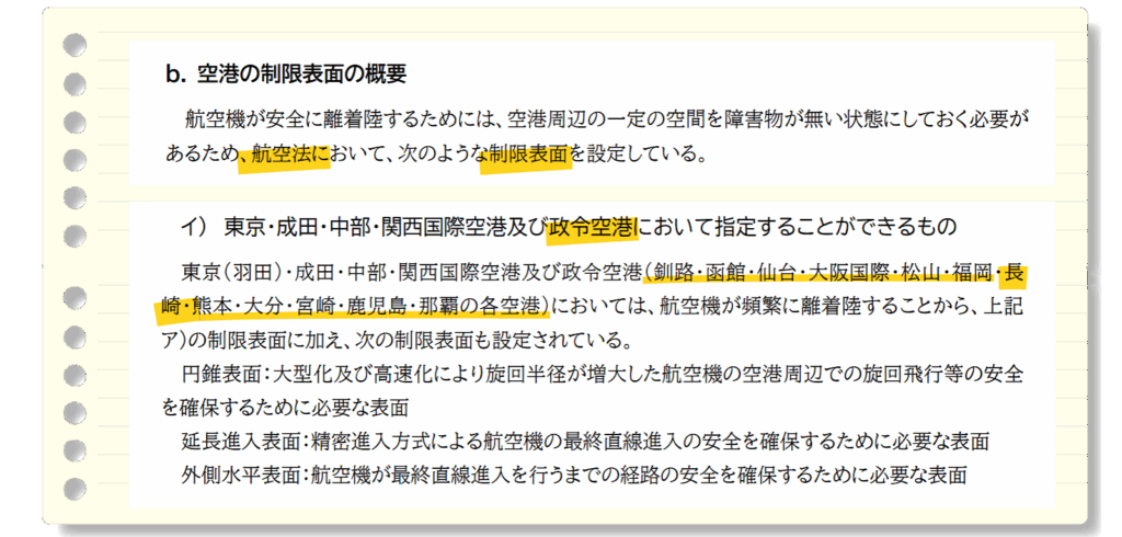 皆さんも普段よく使う空港を調べてみると、空港等の”周辺”の規制を実感できるかと思います。