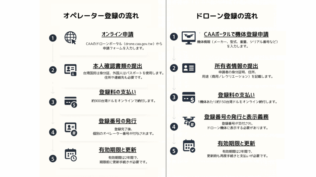 費用 | 登録料 約900台湾ドル(更新時も必要) | 登録料 約150台湾ドル/機体 |