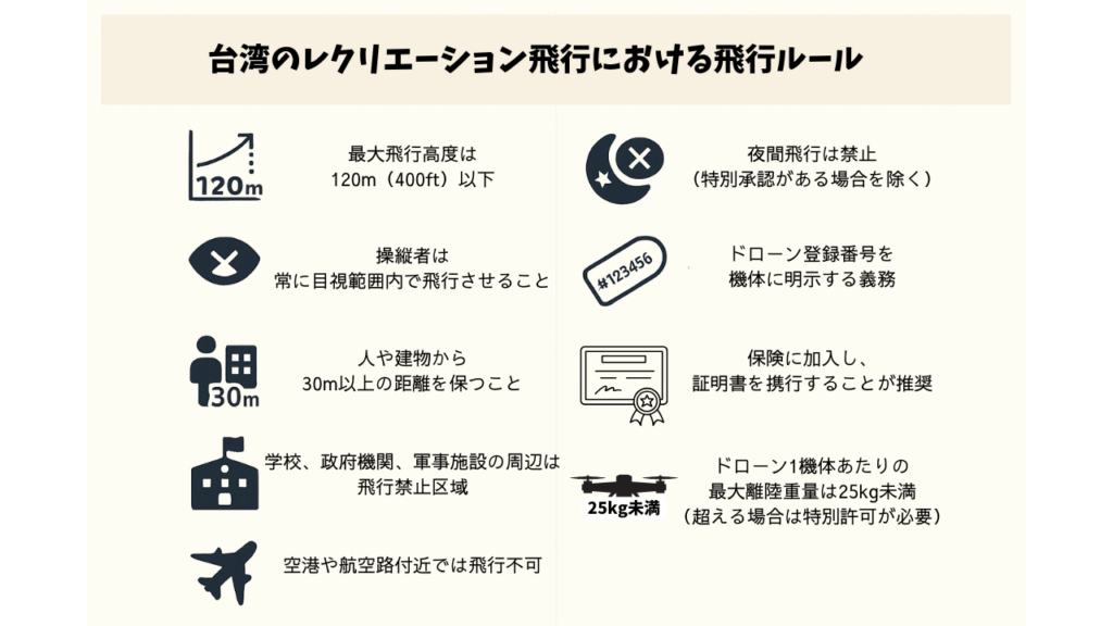 ただし、台湾国籍の操縦者と同じように法律の適用を受けるため、短期滞在の旅行者であっても登録や保険加入など必要な手続きを済ませることが前提条件となります。