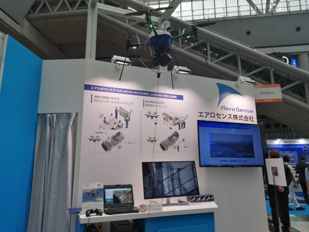 エアロセンスブースでは、エアロボオンエアという大きなカメラ搭載のドローンが展示されており、実際にゲームのようなコントローラーを操作することで、ビッグサイト二階がカメラを通してモニターに写されていました。