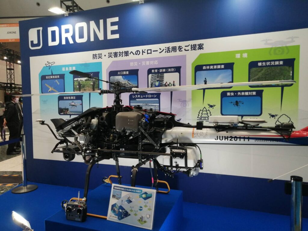 JDRONEブースでは、無人ヘリコプターの中身が見える状態で展示されておりました。