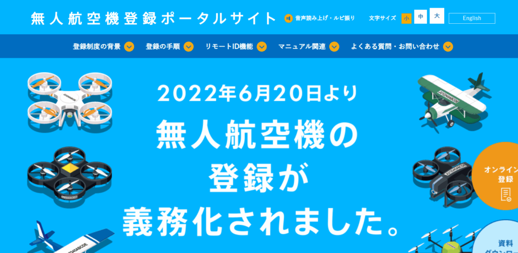 機体の登録は国土交通省の無人航空機ポータルサイトより行うことが出来ます。