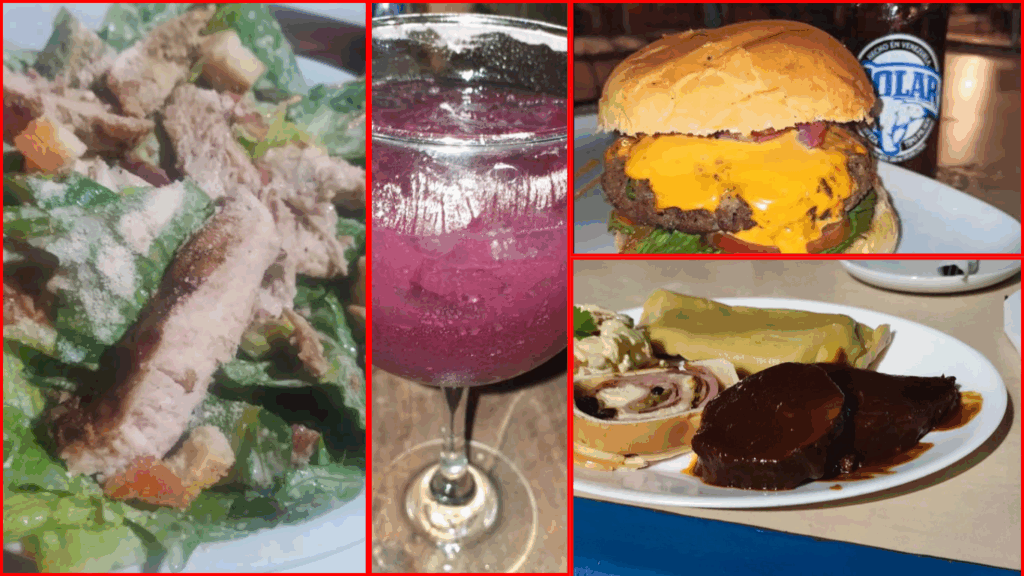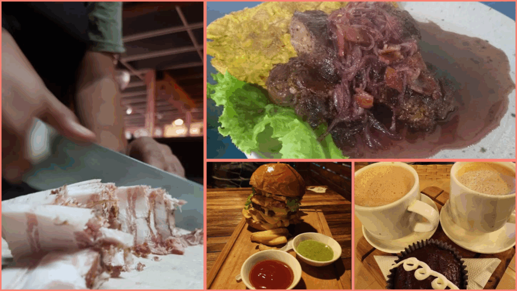 地元の肉料理やクラフトビールが自慢で、ハンバーガーやグリルチキン、ベネズエラ風のタコスなど、旅人の胃袋をしっかり満たしてくれます。特に カリニータ(豚肉の煮込み)はスパイスの効いた味付けで評判。