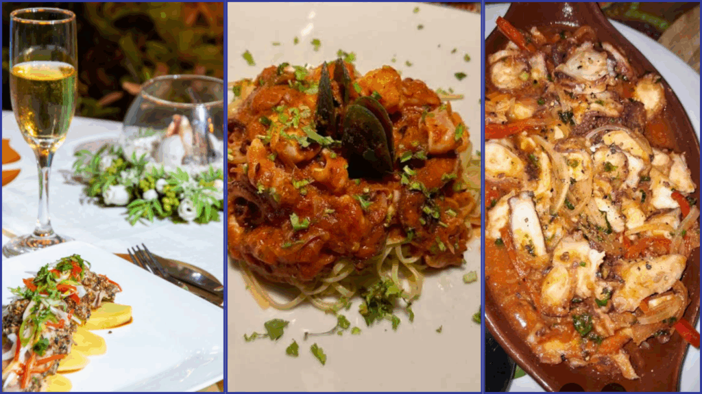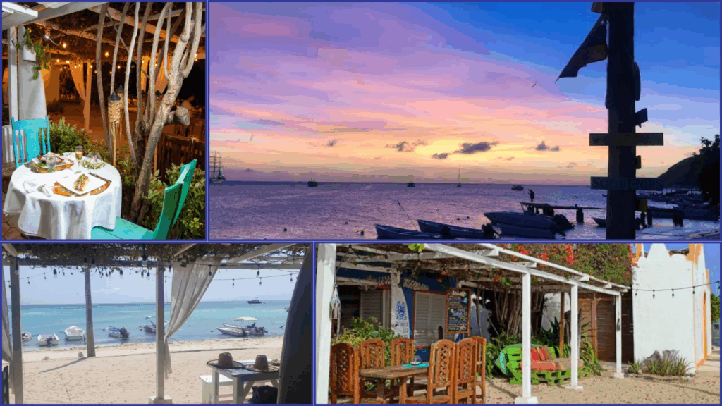 人気メニューは ランゴスタ・ア・ラ・パリージャ(伊勢海老のグリル)やカリブ風魚のセビーチェなど、現地の素材を活かした逸品ばかり。店内は海風が吹き抜ける開放的な設計で、青と白を基調とした爽やかな空間が広がっています。