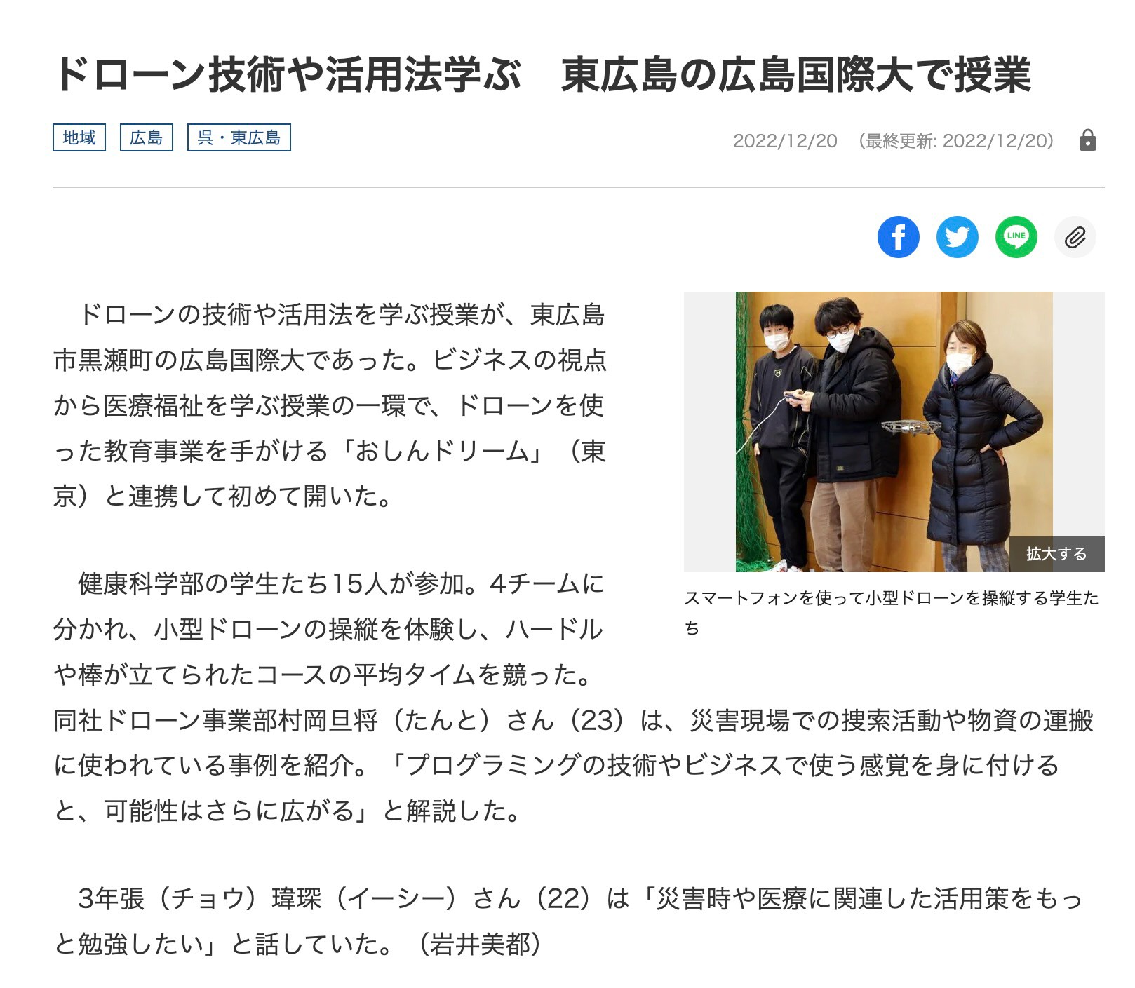 2022年12 月 17 日(土),広島国際大学の健康科学部の講義「ウェルネスビジネス論Ⅱ」にてドローン体験特別講座を行いました。特別講座の様子が中日新聞に掲載されました。