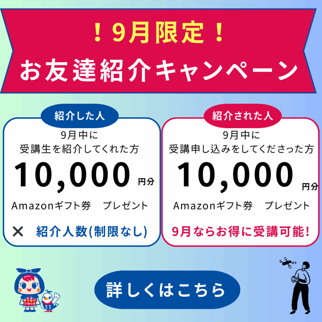 ※ご紹介を受けたお客様が、受講開始前に受講をキャンセルされた場合、両名ともキャンペーン適用外となります。